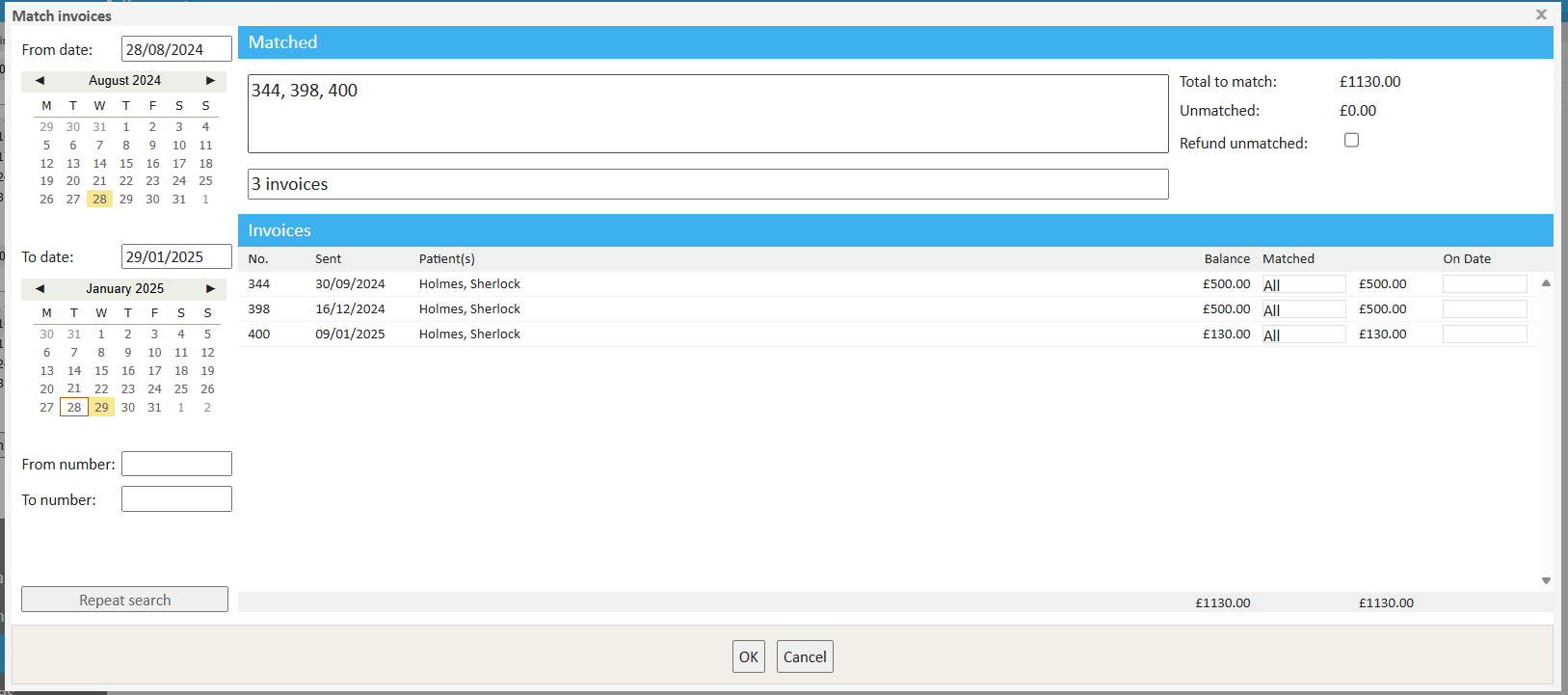 • Click on each invoice to match the full amount, or enter a value in the 'Matched' column to match a partial amount.