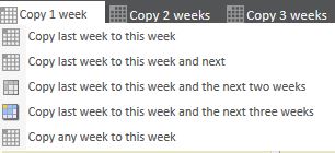Should a Clinician work the same times each week, you can copy the pre-defined schedule for the existing week(s) onto further weeks. This is done using one of the Copy ... buttons situated in the top left of the page.