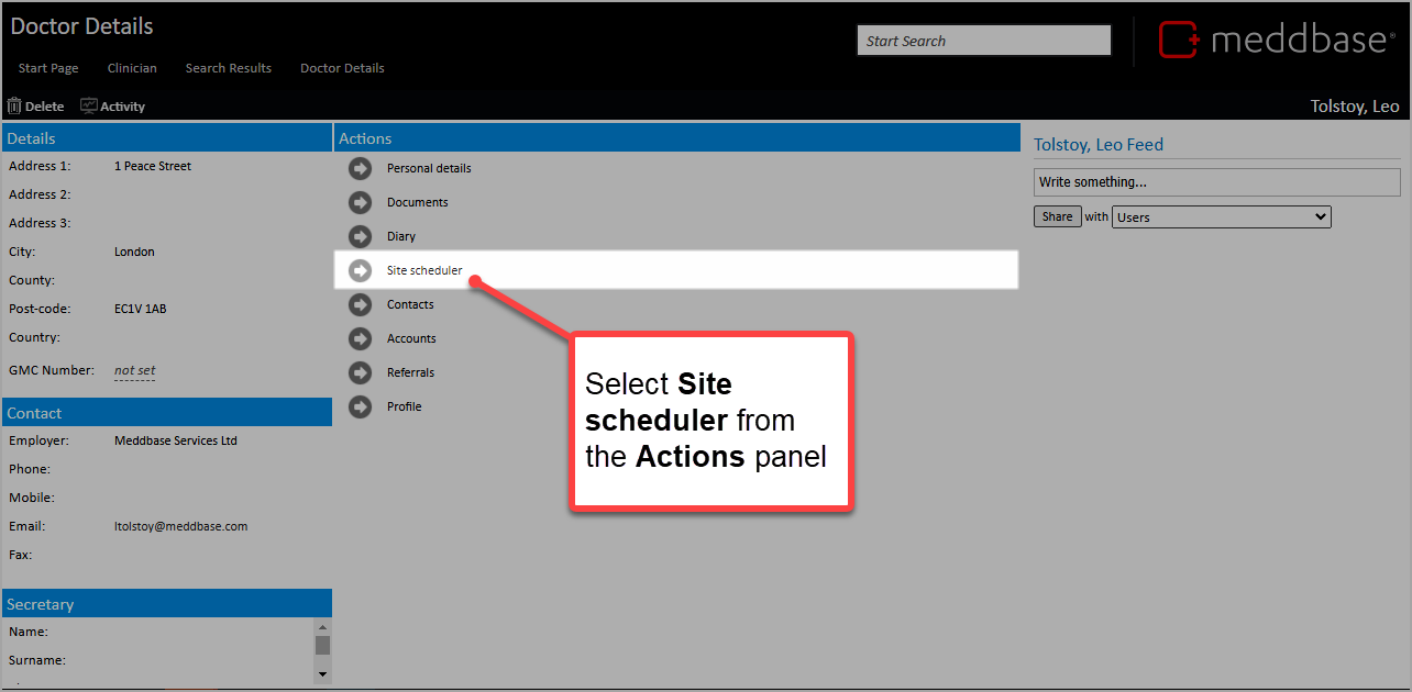 4. From the Doctor Details summary, select Site scheduler from the Actions panel