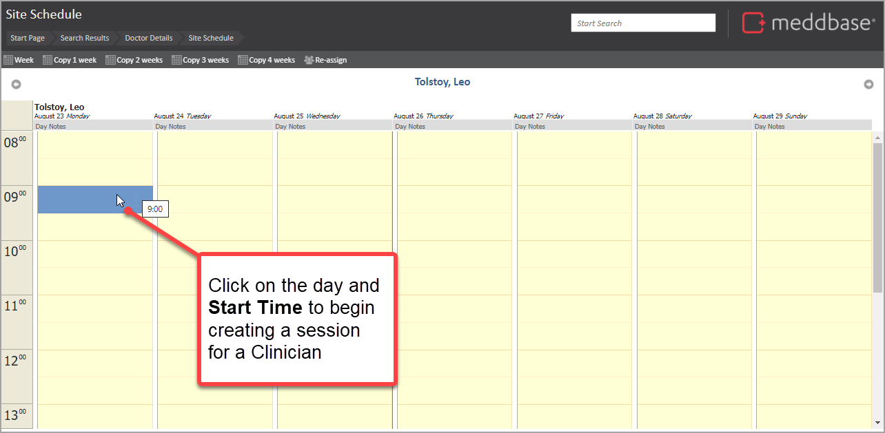 To be able to book appointments with a Clinician, sessions need to be created in the Site Scheduler. To set up one or more sessions for the Clinician's availability: