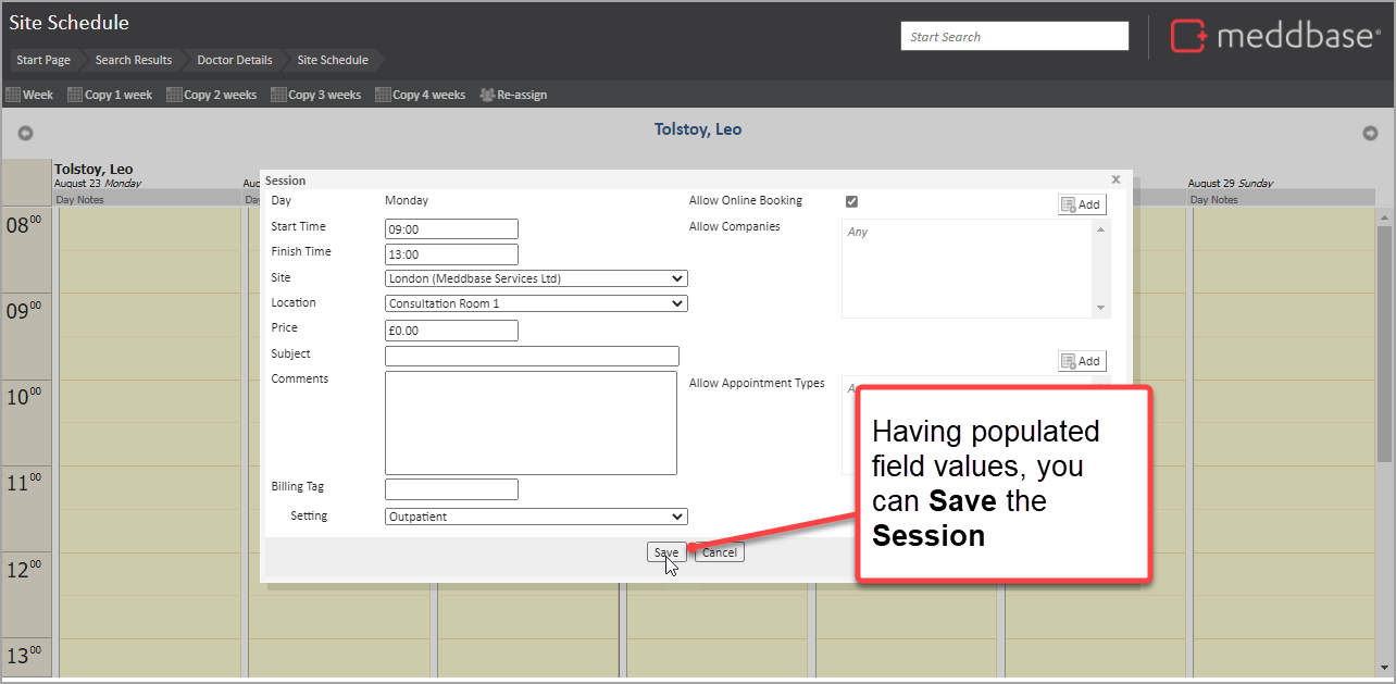 Now appointments can be booked in that session in the Clinician's diary.