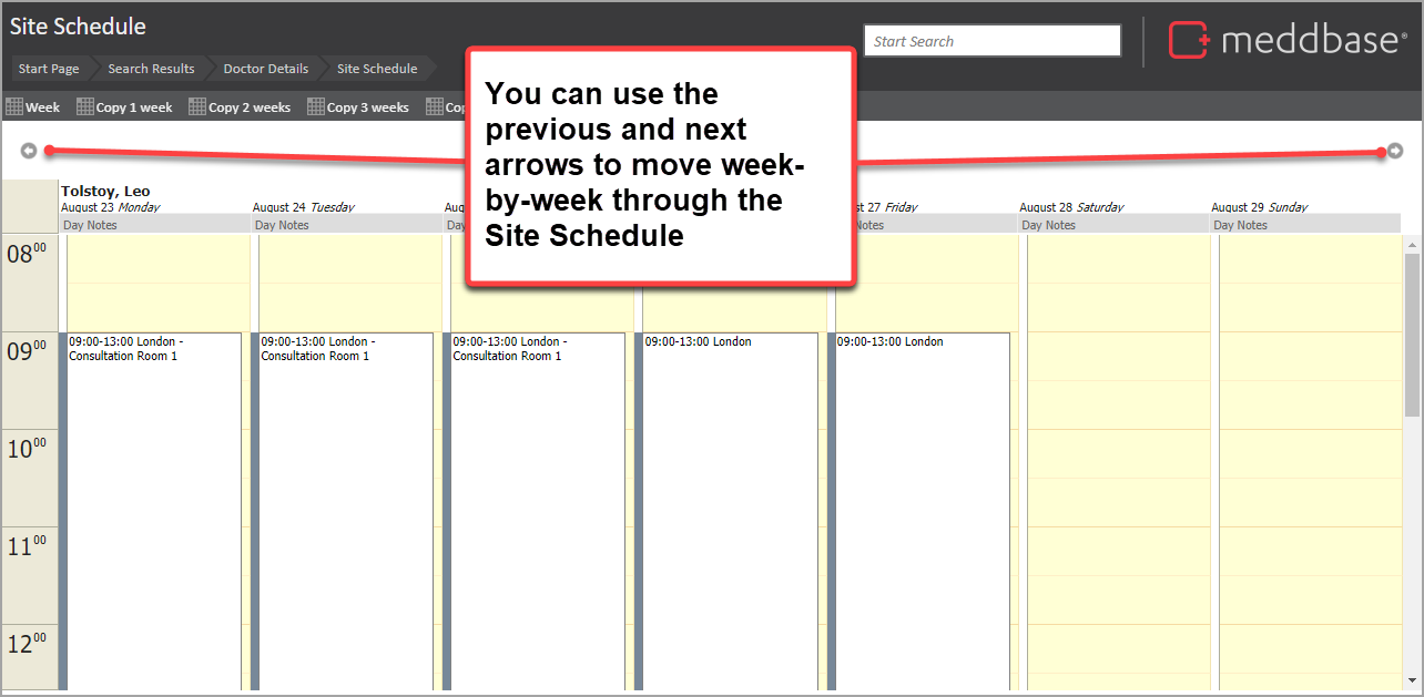There are a few options to enable you to navigate between weeks in the Site Schedule for a Clinician. These are outlined below.