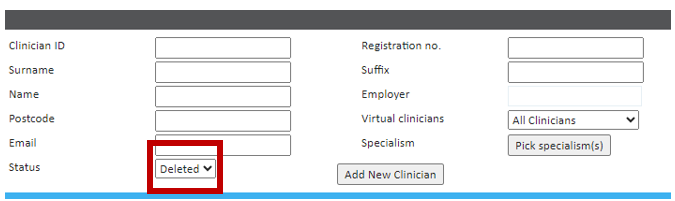 When searching for a clinician to restore, you will need to ensure the 'Status' field is set to 'Deleted'.