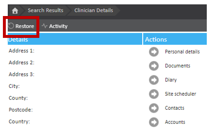 Once you have selected the relevant clinician the 'Restore' button can be found at the top left of the screen, underneath the breadcrumb trail.