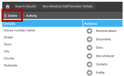 Once you have navigated to the staff member page, at the top left, underneath the breadcrumb trail, you will find the 'Delete' button.