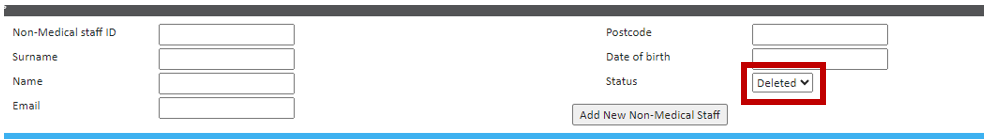 When searching for a staff member to restore, you will need to ensure the 'Status' field is set to 'Deleted'.