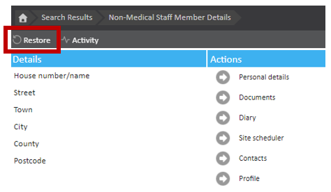 Once you have selected the relevant staff member the 'Restore' button can be found at the top left of the screen, underneath the breadcrumb trail.