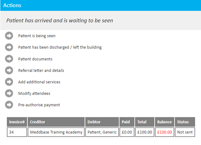 Clicking the 'Patient has Arrived' button changes the state of the appointment and carries out a range of actions:
