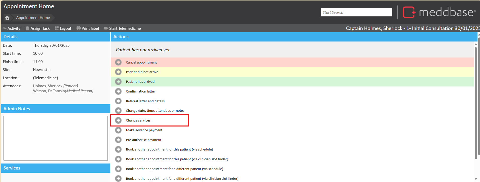 - Before the appointment starts – Open the appointment home page and click ‘Change Services’ in the Actions Pane.
