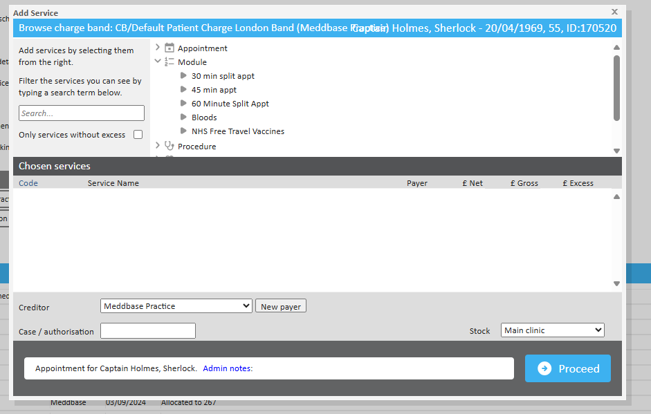 - Adding a Service – Click on a service to move it to the ‘Chosen Services’ box. The system will automatically populate the price based on the patient’s charge band.