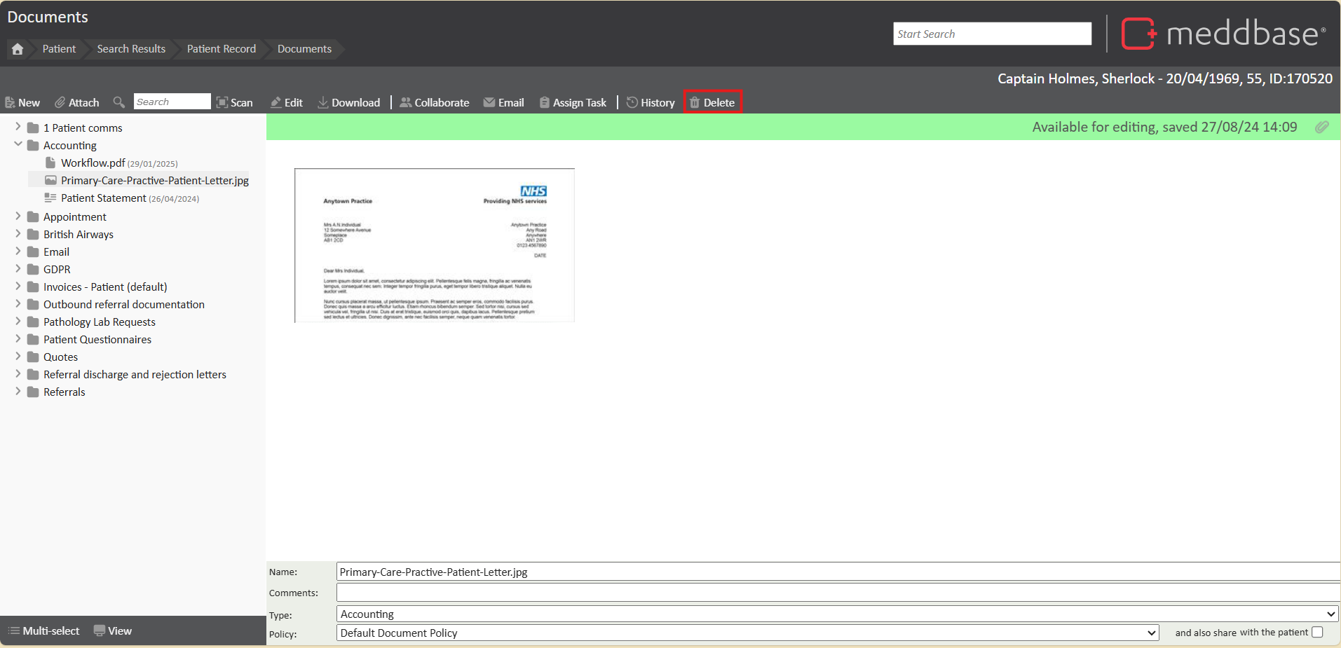 Meddbase provides a "Deleted" view where deleted documents are temporarily stored, allowing users to review and restore them if necessary. This feature ensures that no document is permanently erased from the system without the option to recover it.