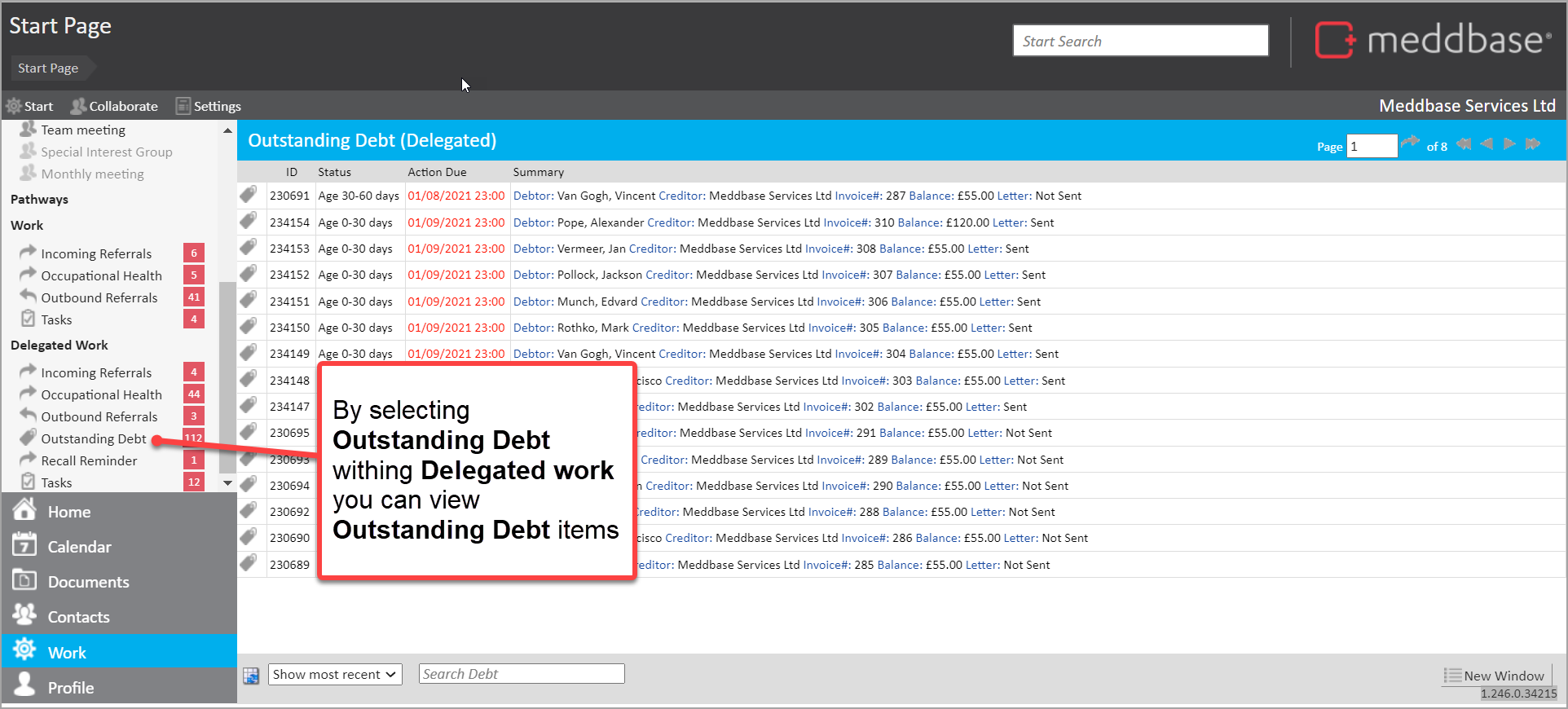 The Outstanding Debt feature in Delegated Work allows you to view and manage invoices with an outstanding balance.