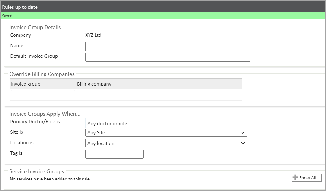 | Please note: If multiple invoice groups are required, you can enter a ‘Default Invoice Group’ in the section at the top. This will default all invoices to be created by that company unless overridden. |