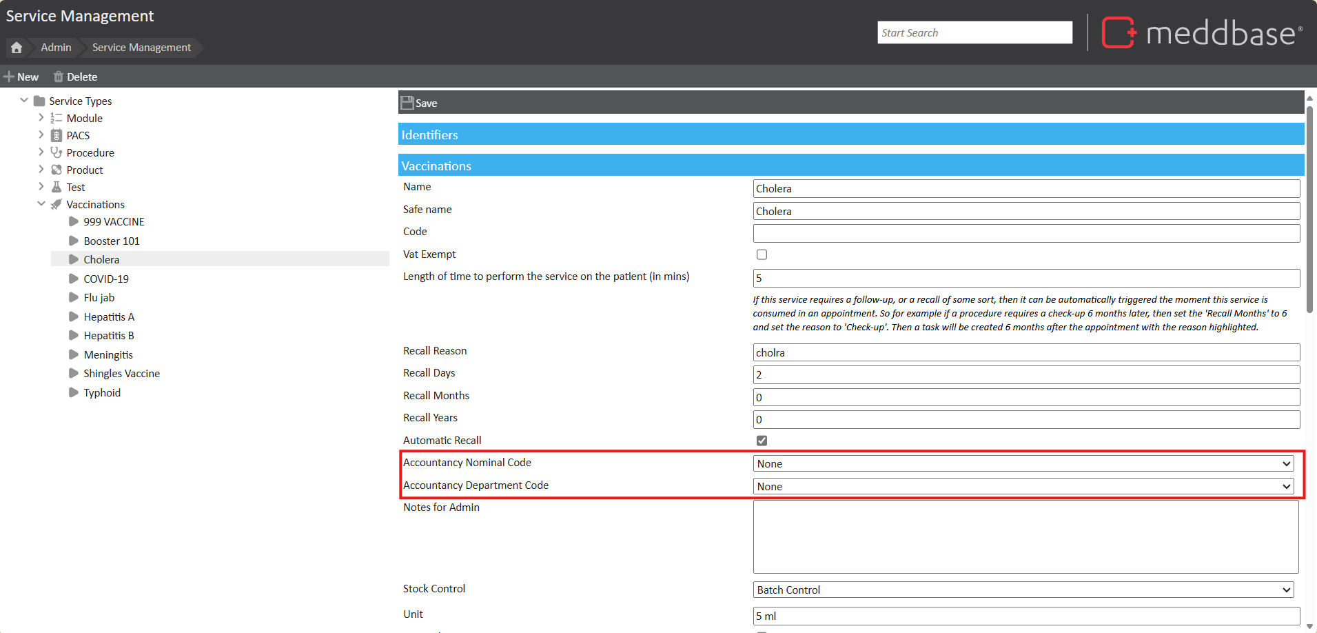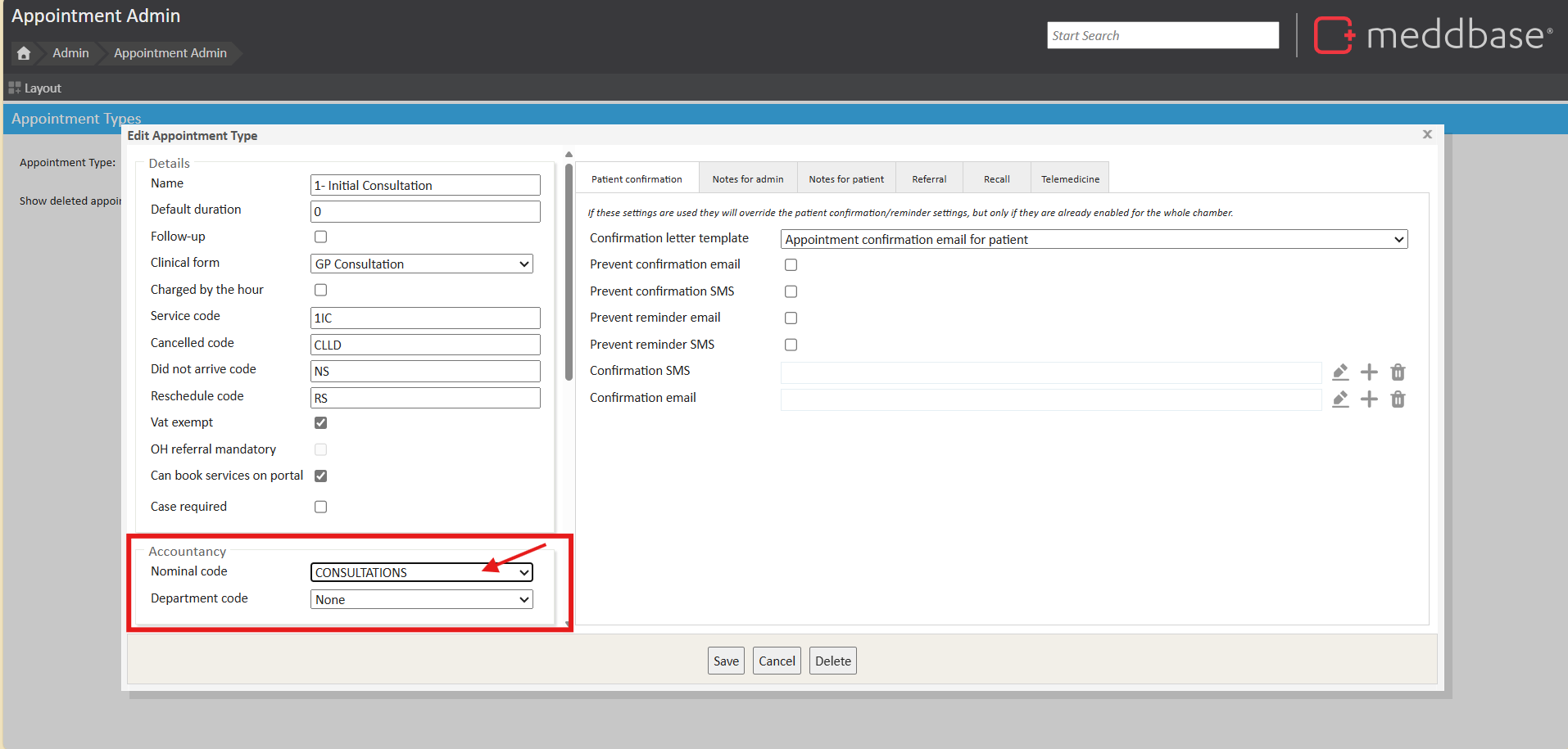 Once saved, the nominal and department codes can be assigned to appointments and services. To do this, navigate to Admin > and either Appointment Admin (for appointment types) or Service Management (for services such as vaccinations, procedures etc.). Next, find the appointment or service you want to assign a code to, search for your code from the dropdown and save.