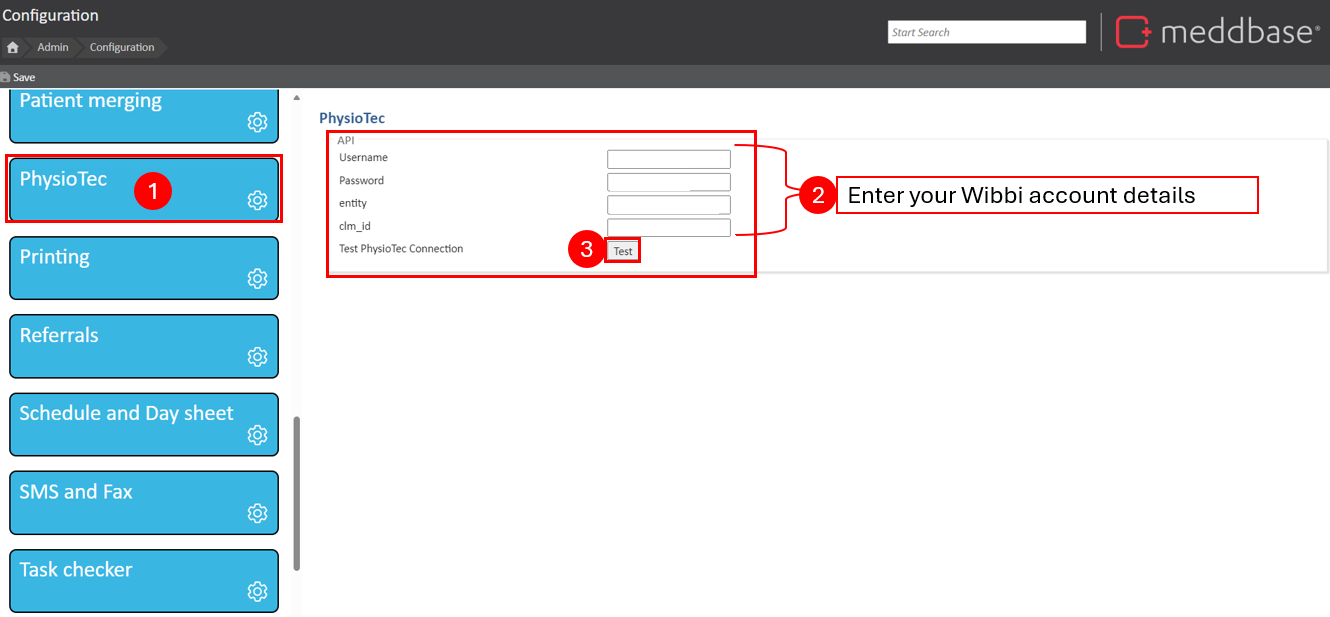 Once Wibbi has been enabled in your chamber, you will need to provide your Wibbi Credentials. To do this, you will need to go to Admin > Configuration > PhysioTech.