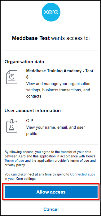 6. Choose an organisation to link your Meddbase account to (as below) and click Allow access.