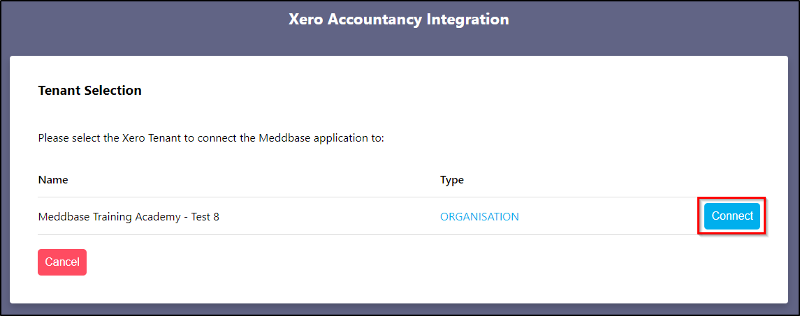 7. Next, you will be prompted to select the Xero tenant to connect the Meddbase application to and click Connect.