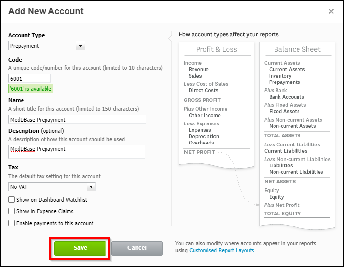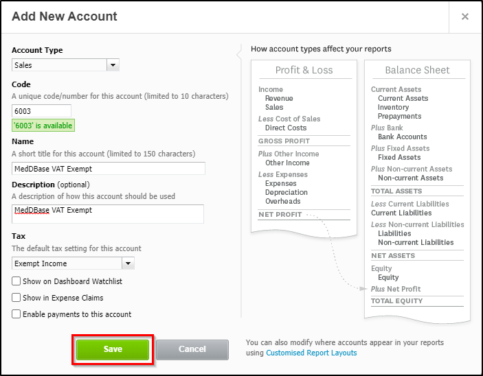 - Code - this is a unique code for this account in your chart of accounts. This can be anu number, and Xero will automatically check whether it's available or not. It is recommended to use a high number, e.g. 6003, to keep Meddbase accounts separate from your other accounts.
