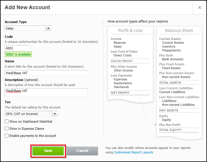 - Code - this is a unique code for this account in your chart of accounts. This can be anu number, and Xero will automatically check whether it's available or not. It is recommended to use a high number, e.g. 6002, to keep Meddbase accounts separate from your other accounts.