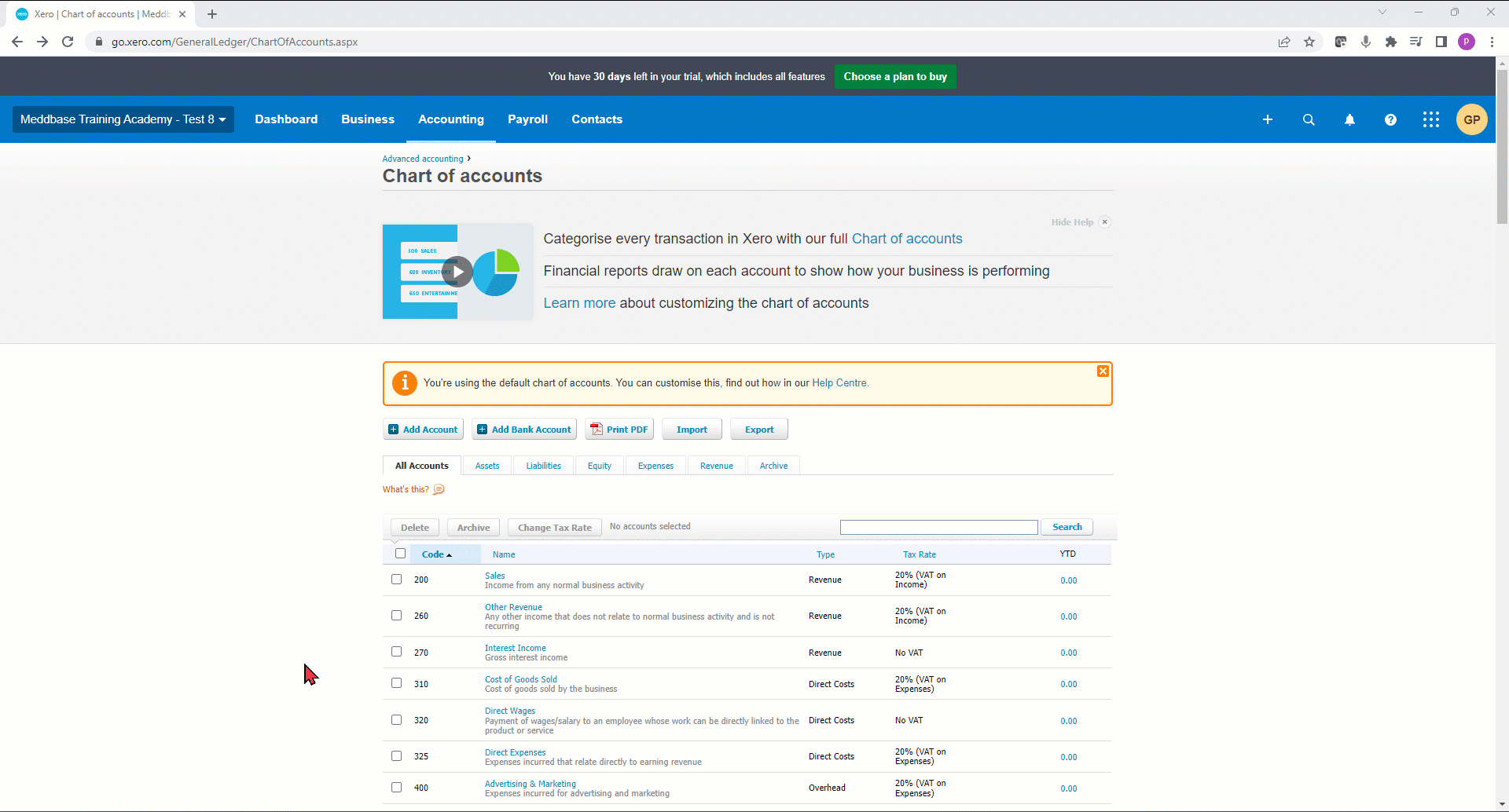 Xero Chart of Accounts Configuration