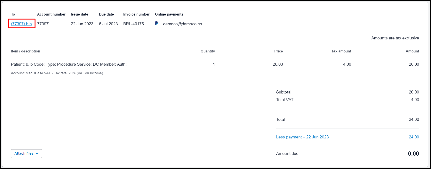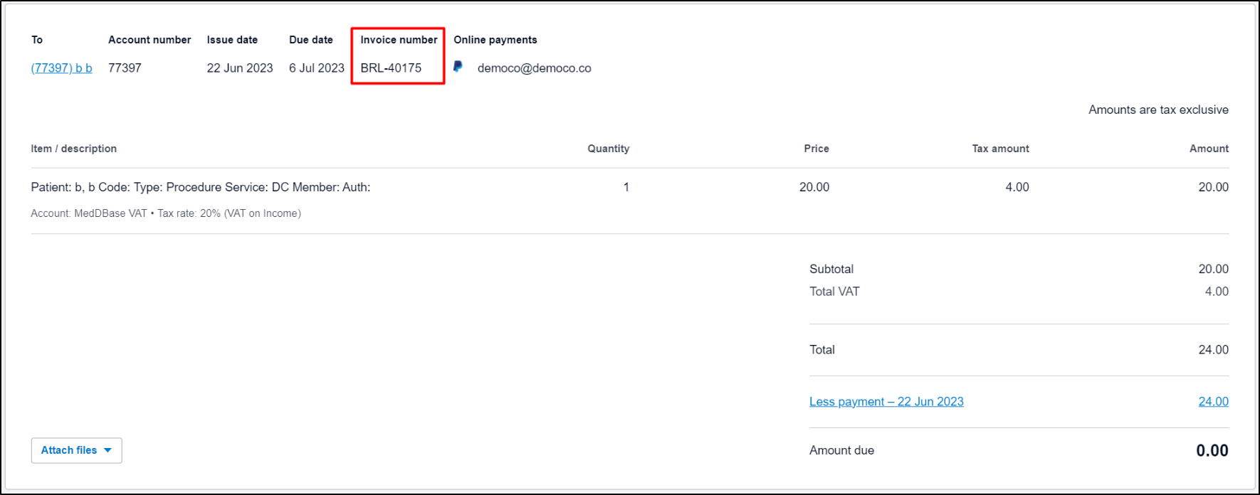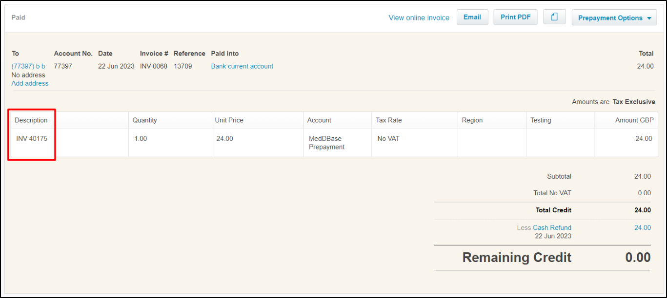 - So, if you successfully can see your above invoice in Xero, now match/apply a payment to that invoice in Meddbase.