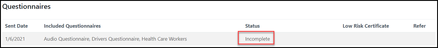 Once sent, the questionnaire will appear on the employee’s profile with a Status of Incomplete.