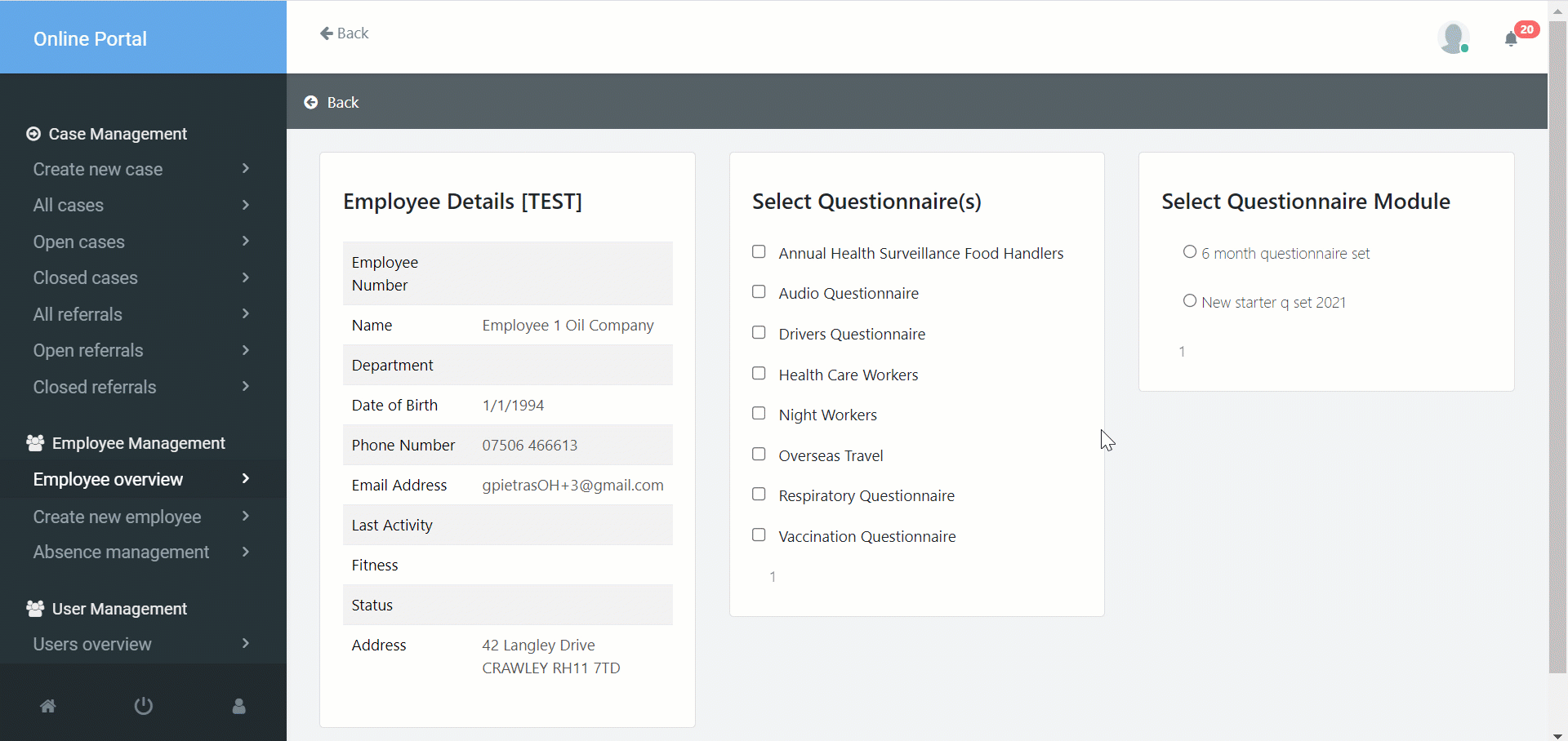 Sending a questionnaire to an employee via the Referral Portal