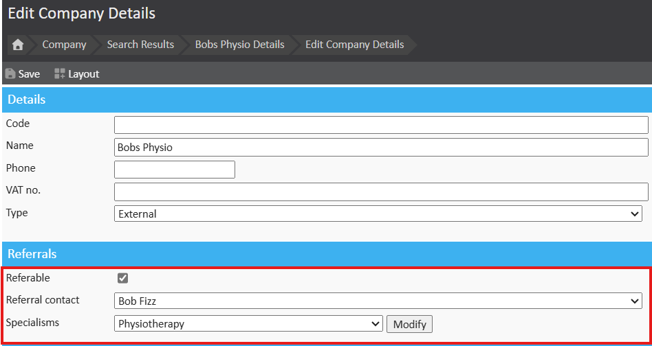 Before you can refer patients to external providers, you need to ensure that the external company (where the specialist clinician works) is set up correctly in Meddbase: