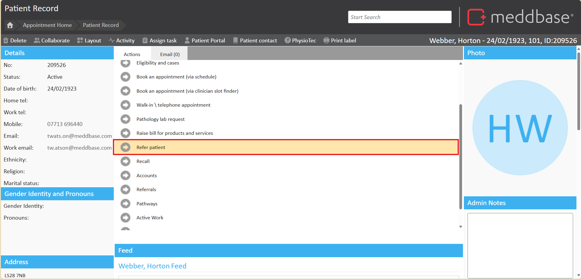 Any user within the organisation can make an outbound referral . The referral will be initiated from within the patient record either during the consultation (By clicking the ‘Refer Patient’ action button at the bottom of a consultation form) or standalone (By selecting ‘Refer Patient’ from the patient home page).