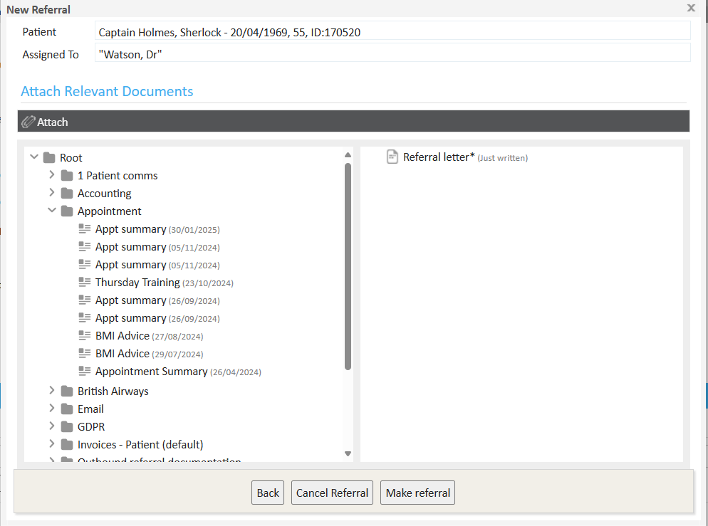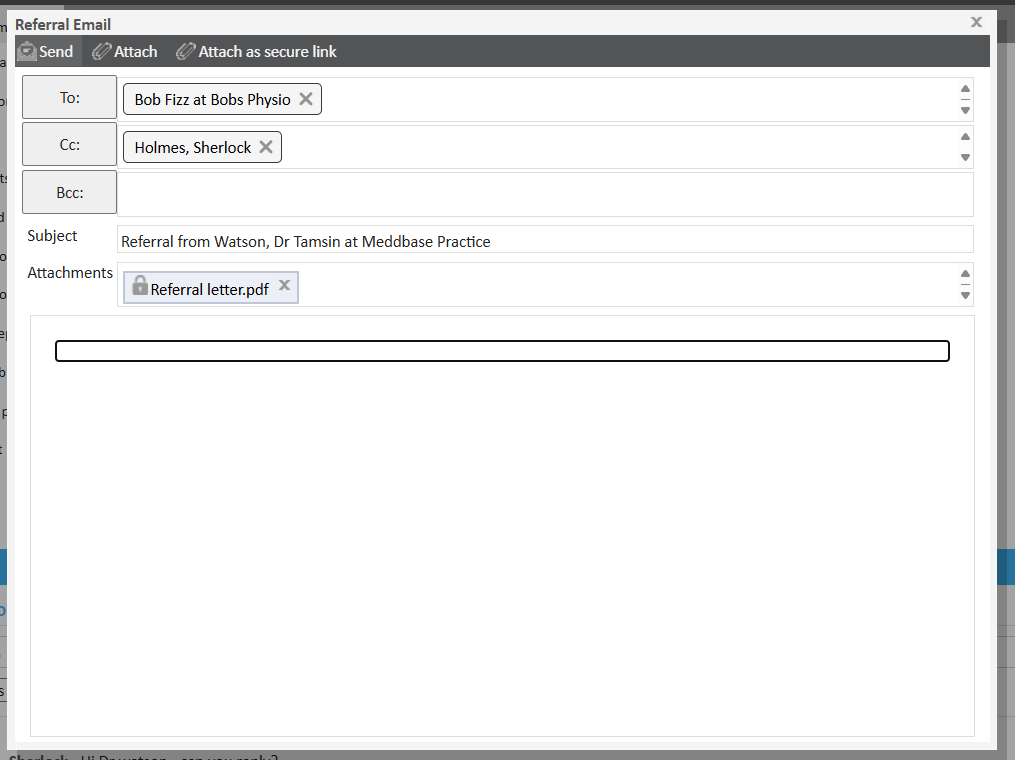 The referral letter will be automatically attached as a secure attachment link, ensuring the information is sent safely and is easy to access for the recipient. To learn more, see Sending an attachment as a Secure Link. -