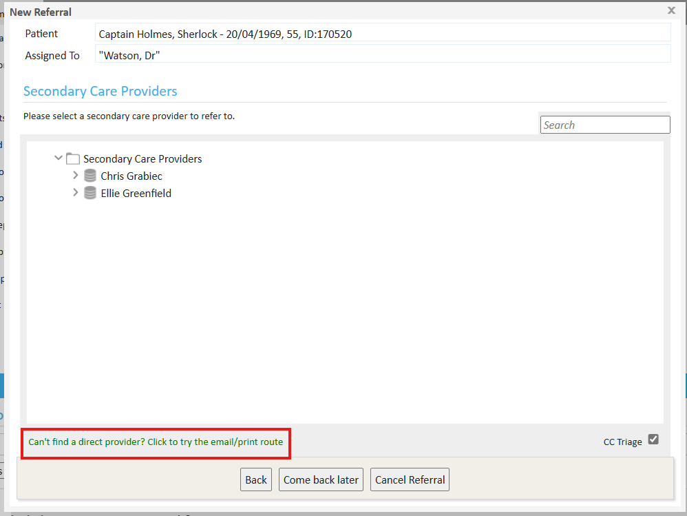 As this is an external provider, we will need to go via the email/print route. On the bottom left of the window, click on the green Can't find a direct provider? Click to try the email/print route.