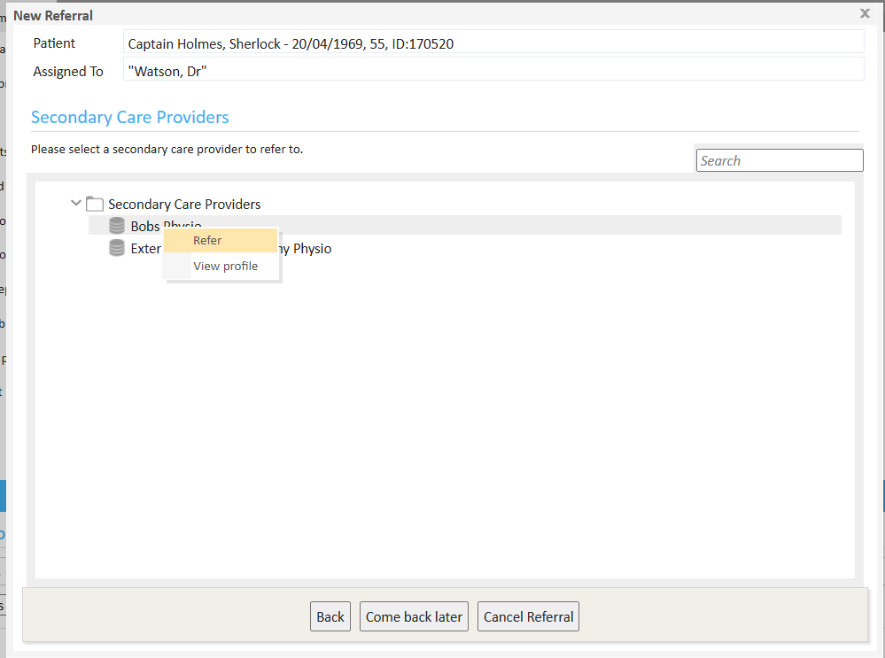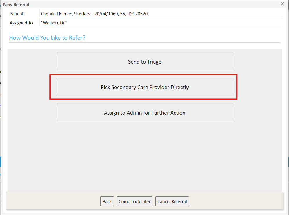 If you opted to make a referral via Specialism, you will be presented with different ways in which to refer. Click "Pick Secondary Care Provider".
