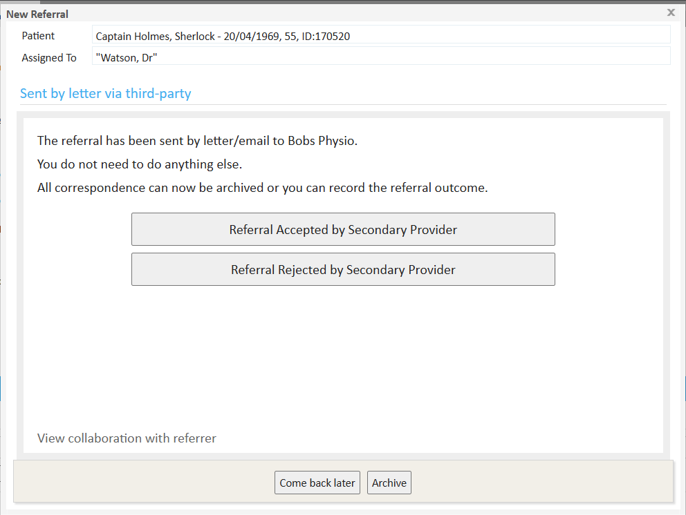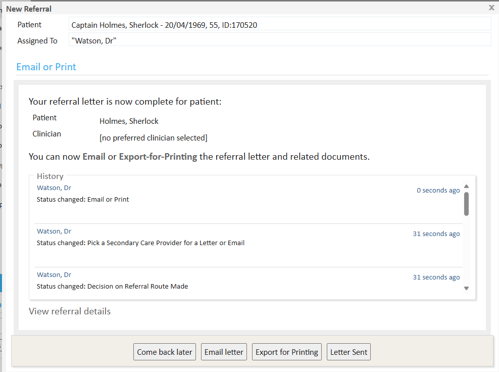 The next step is to Email the referral or Print the Referral letter to send manually.
