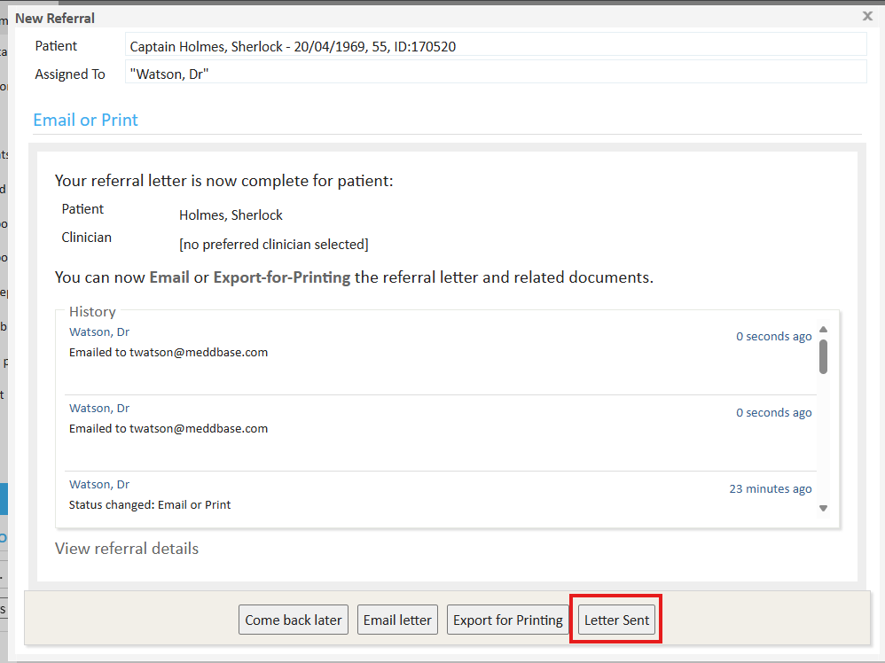 Once the email has been sent, you will see the History log of the referral be updated. Click Letter Sent.