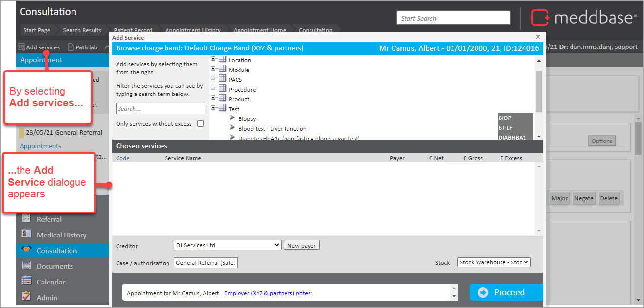 By clicking Add services, you can add further services to the consultation, according to the patient's (or their preferred payer's) eligibility.