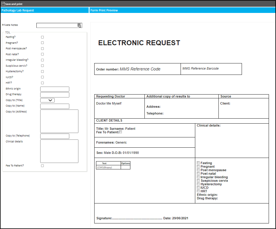 *The below is an example request form for TDL. The Pathology Request form(s) are generated from templates which are configurable.
