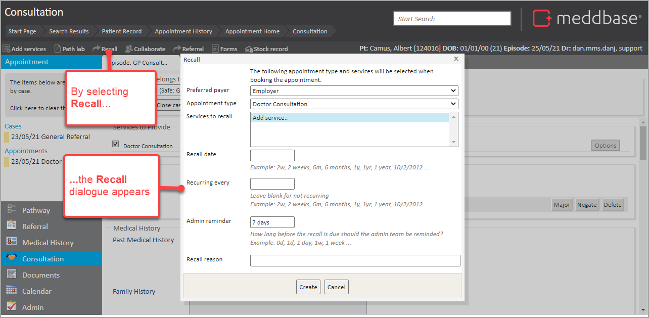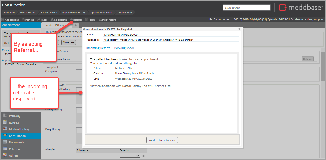 When an appointment has been booked in Meddbase following an OH referral, patient attendance for an appointment triggers a series of steps in Meddbase from patient arrival through to consultation. This enables intuitive and comprehensive management of the process and clinical findings during the patient encounter.