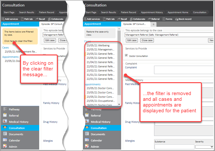 The panel on the left makes available the Case filter. By default, the case for the current episode is presented. By selecting the wording Click here to clear the filter the Cases list is unfiltered so that you can view other cases for this patient.