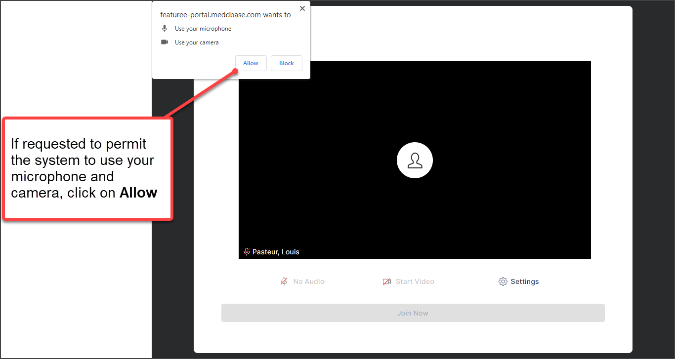 6. If requested, permit the system to Use your microphone and Use your camera by selecting Allow
