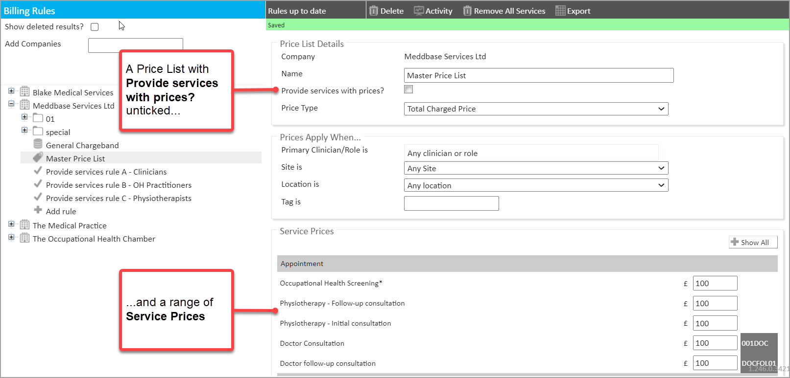 To provide a practical example of how a set of Provide Services Rules on a Chargeband can work to make specific services available when booking an appointment.