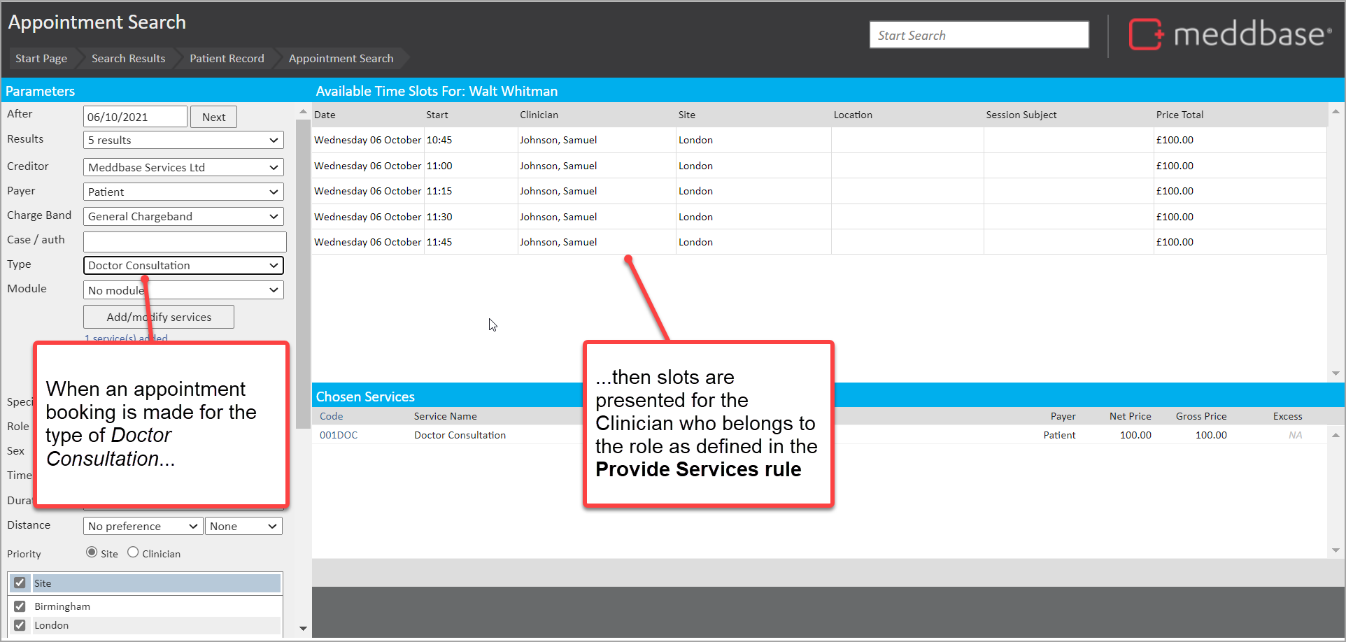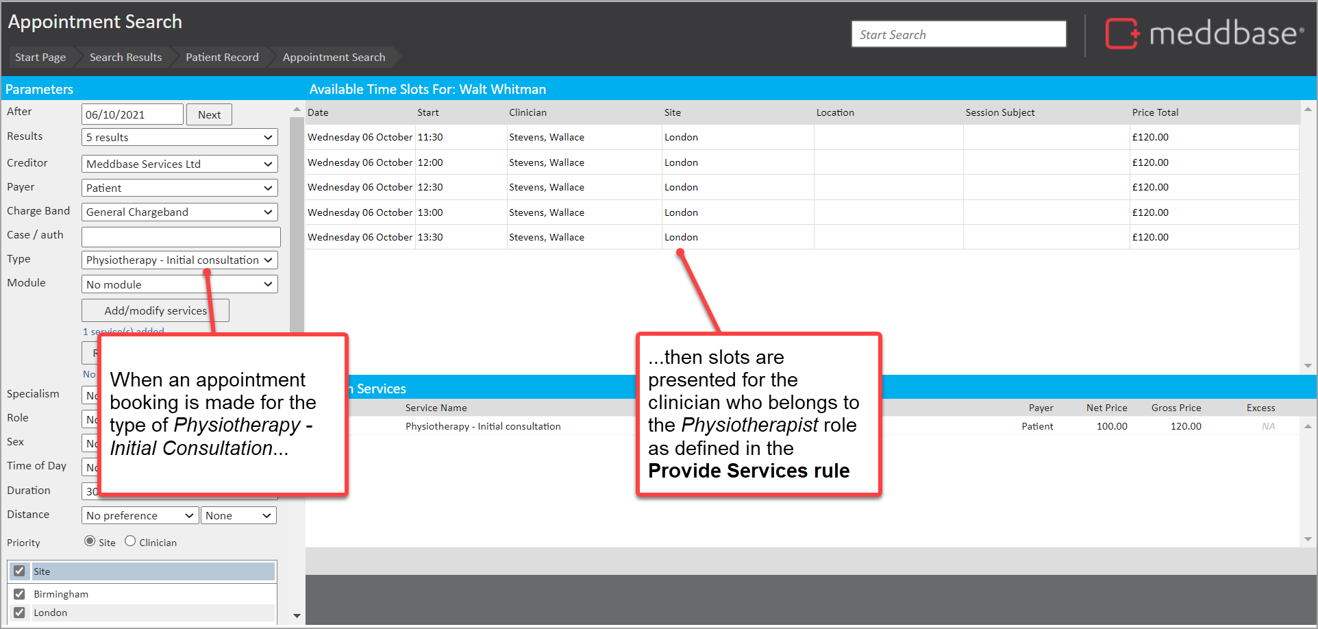 Example C - Booking an 'Physiotherapy - Intial Consultation', restricted to the role of Physiotherapist