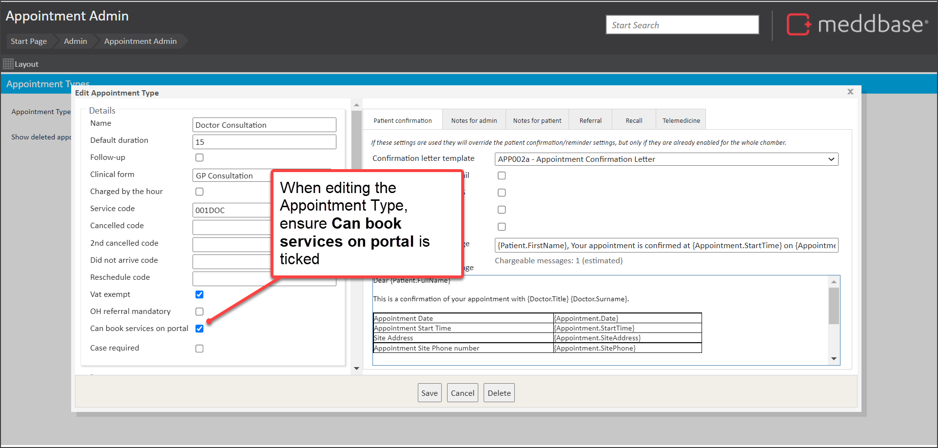 Step 1 – Configure Appointment Type to allow services to be booked on the Patient Portal