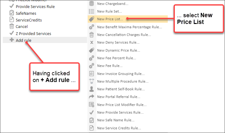 2. Find the required company and select + Add Rule > New Price List… from the menu