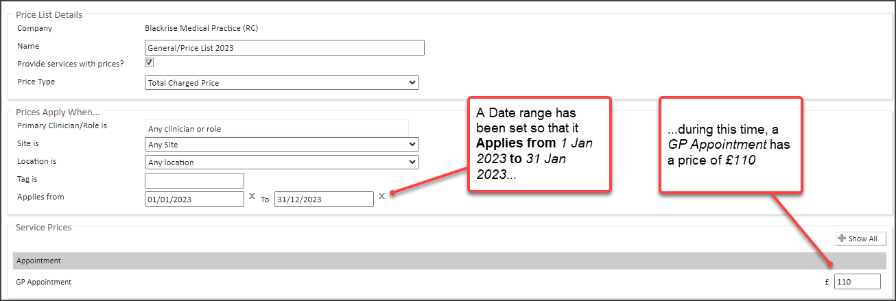 2.4 So the price list Date Ranges dictate that the Service Price is £110