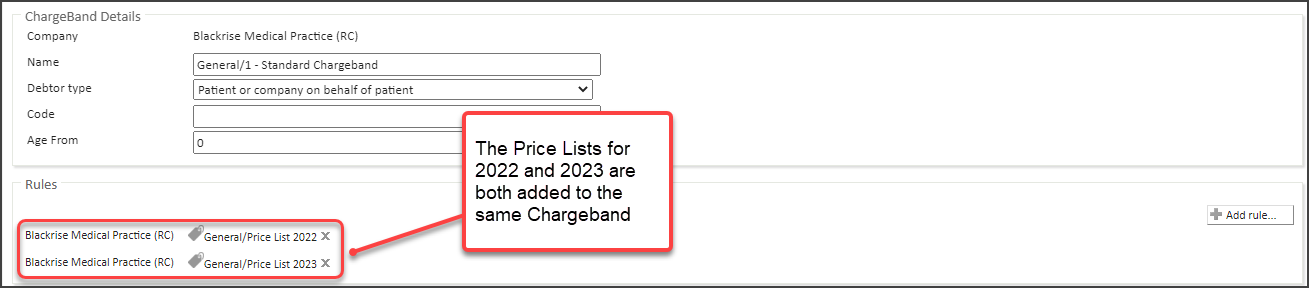 3. Then both Price Lists are added to a Chargeband called 1 - Standard Chargeband