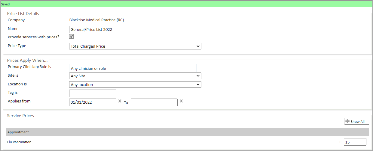 1. A Price List has been created that is valid between 1 January 2022 and 31 December 2022