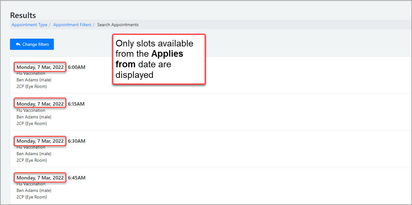Then only appointment booking slots are shown which meet the Applies from date criteria set in the Patient Self Book Rule.