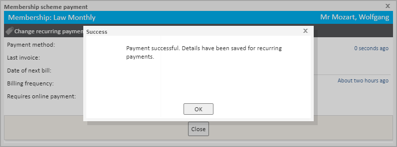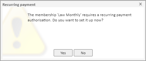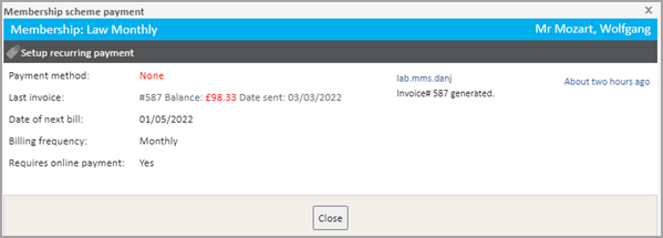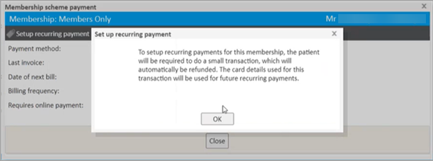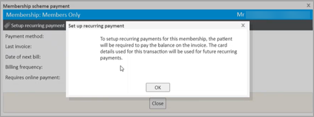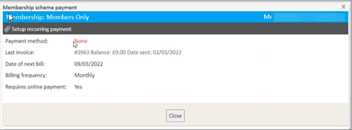 When this happens, the user is presented with a Membership Scheme payment dialog which enables the setup of a new recurring payment.