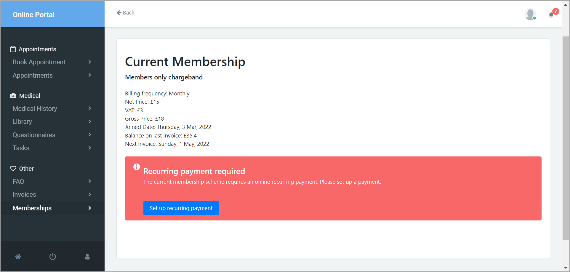 Scenario 1 – Patient already on a members-only chargeband with a recurring payment – with no outstanding invoice