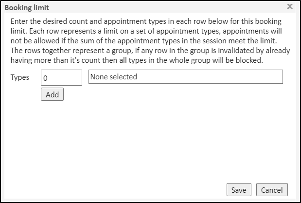 e.g. if you configured a count of 2 and selected the Medical Screen and Medication Review appointment types in the row then this corresponds to limiting the site session to having at most 2 appointments of those 2 types combined, not individually.